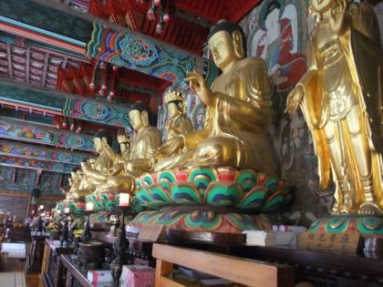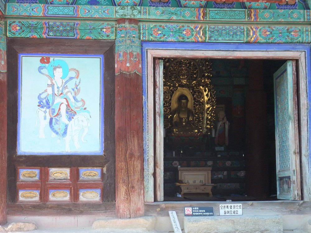 The next morning we were up at 3am to observe the monks’ daily morning prayers in the main temple hall. It is a gorgeous temple with statues representing several of the main Buddhas – medicine, shakyamuni. I wish I had written down the list when they were doing the tour because I can’t remember them all, and some are specific to Korean Buddhism. One thing I’ve noticed in almost all the Korean temples I’ve visited is a lack of the Taras – the 24 female Buddhas.