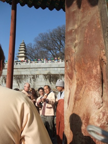 Our monk host and translator describing how it is unique to Korean temples to use the natural shape of the tree as pillars to the the buildings. He was a wonderful host, extremely open, friendly, and excited to share. He said the first time he was given the temple stay for foreigners as an assignment, but ever since 2004 he’s volunteered to be the person to be in charge of leading them.