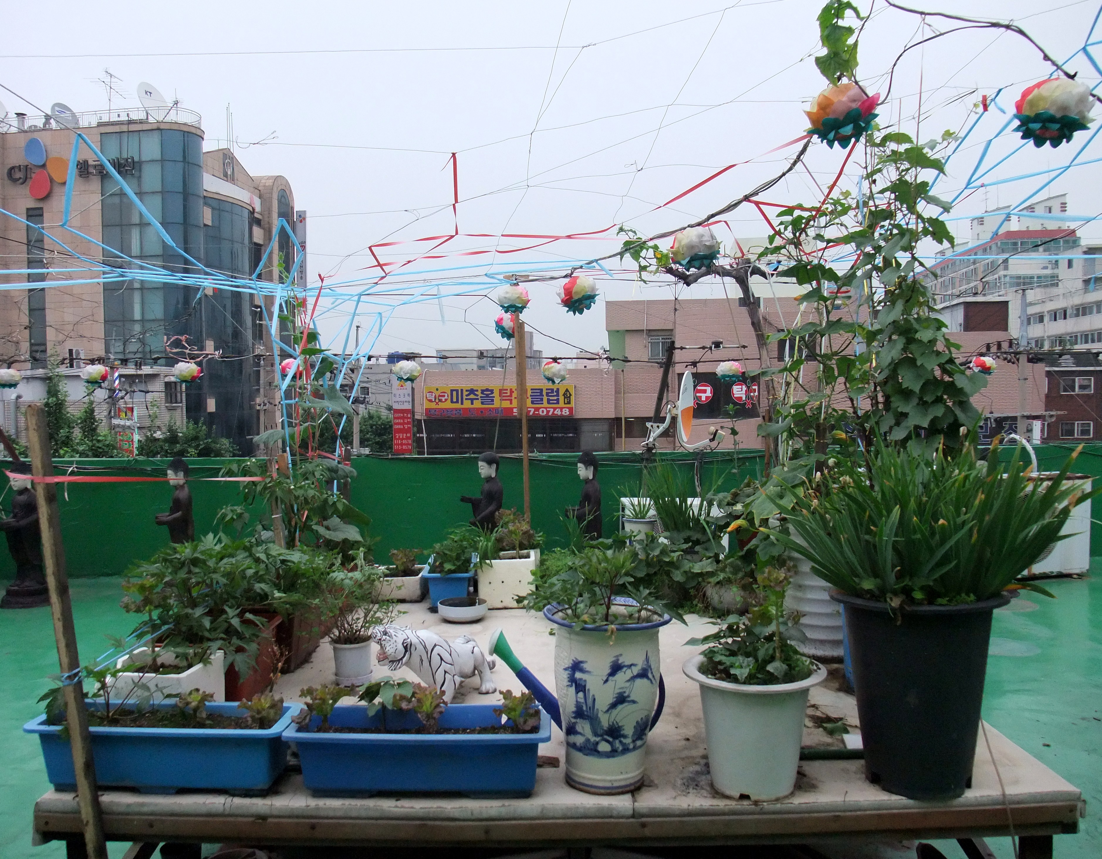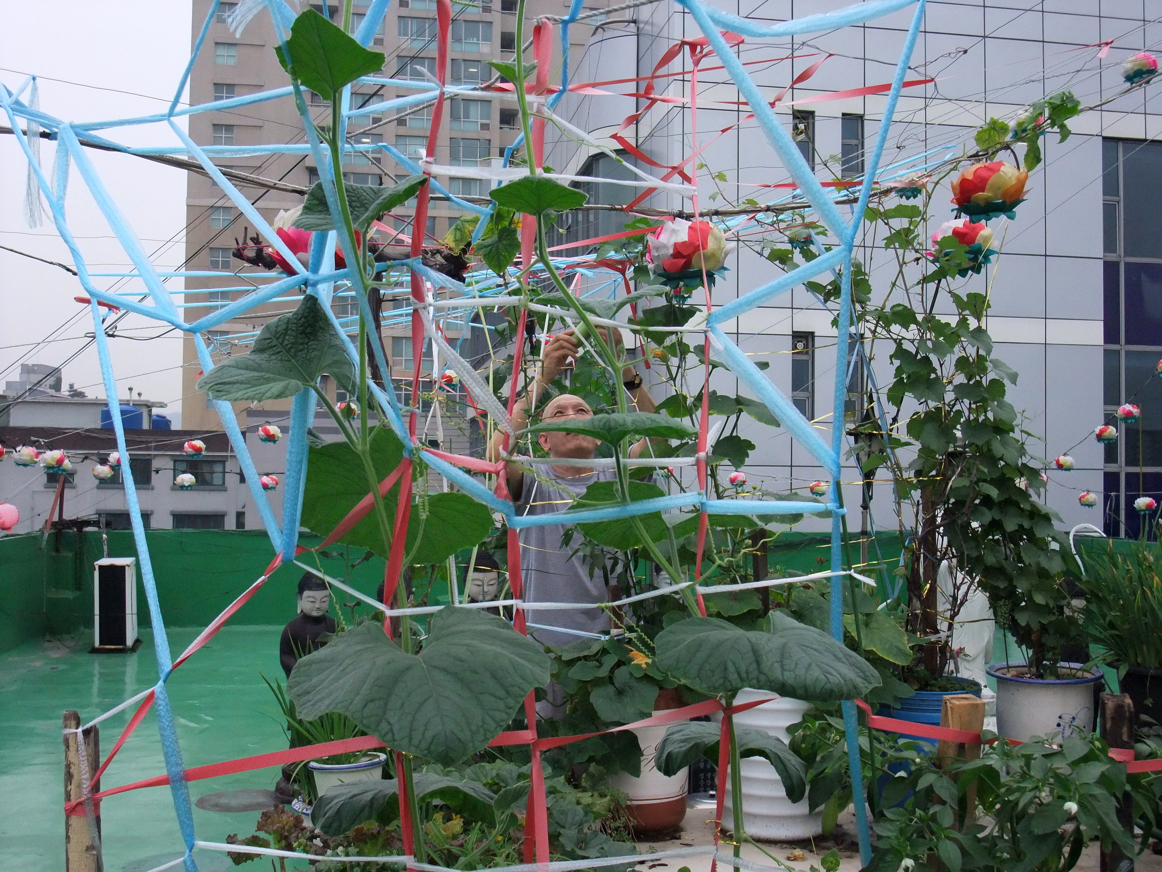 With no one around I did a few prostrations and sat for a few minutes, and then nosed around trying to find the rooftop shrine that I was pretty sure existed. On my way through the door to the rooftop I literally ran into a monk. He was at first shocked, and then pretty happy to see me. He even gave me a zucchini from their rooftop garden. I speak almost no Korean, and he speaks almost no English, but I did glean that he was in the Korean war from pictures he showed me and was quite happy to meet a young American.