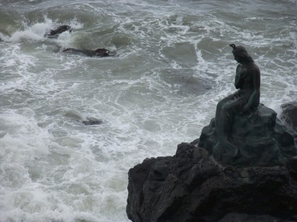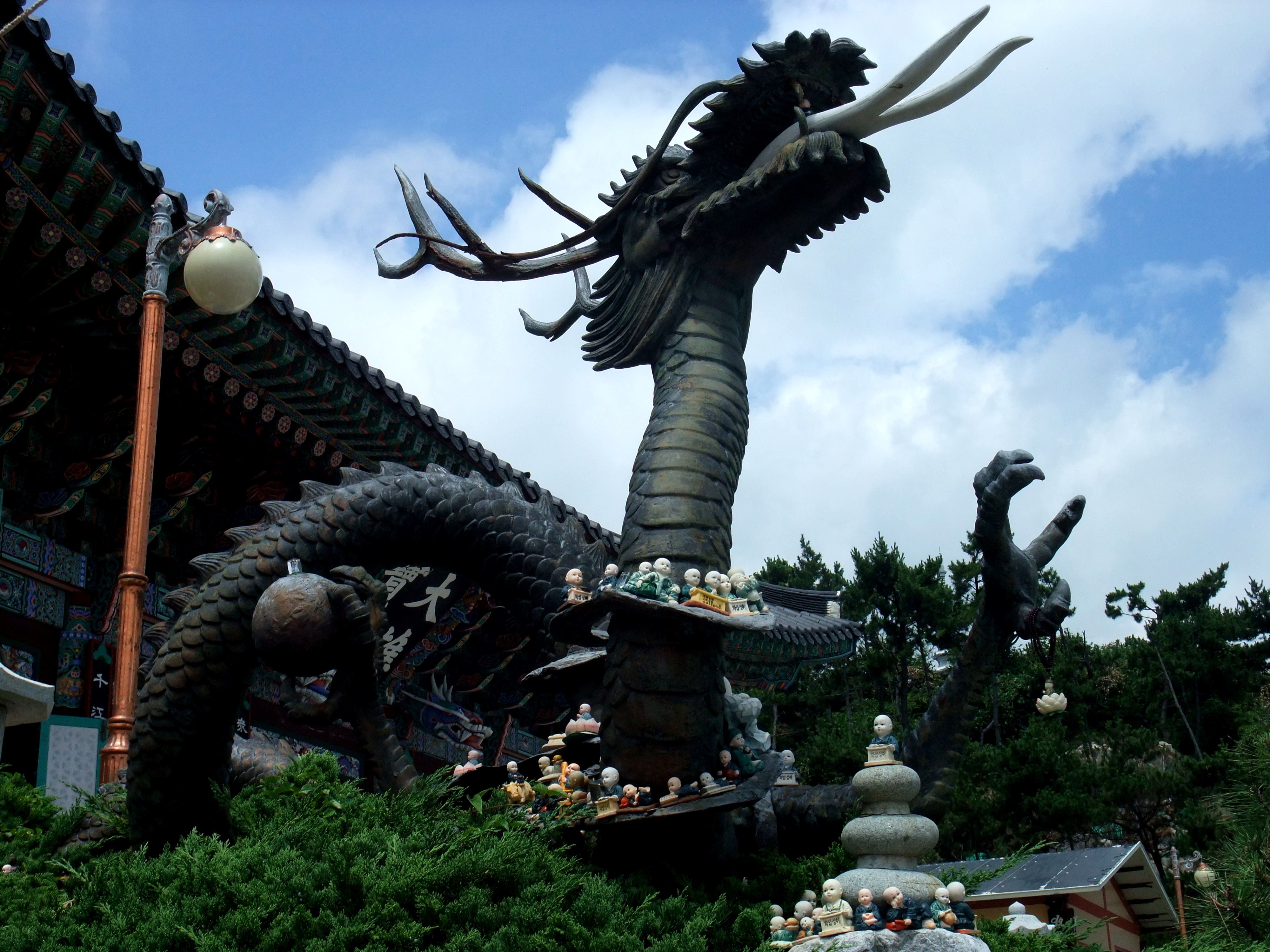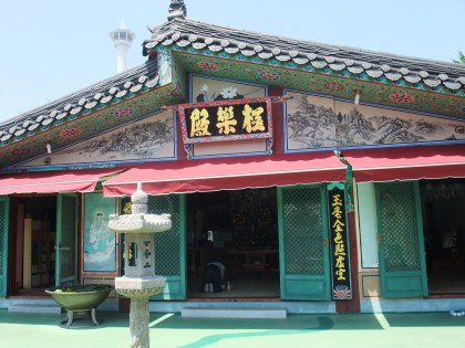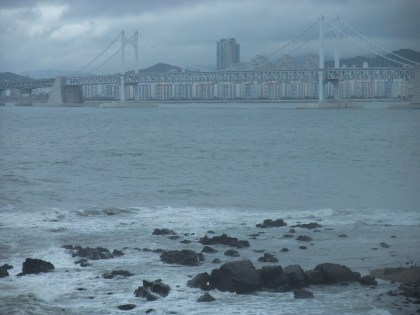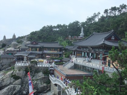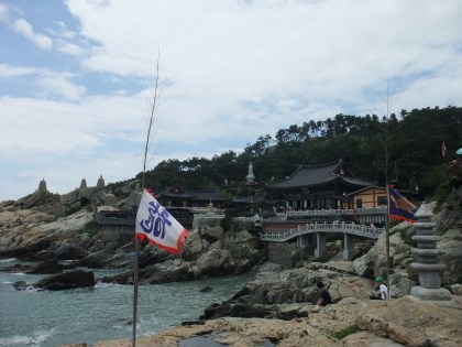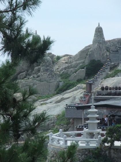 There is a great train system in Busan. The subway is great, but I had no idea how much I liked trains. For all of 2,500W I took the train from Bukjeon station to Songjeong beach. From there you could take the 181 bus, but, me being the adventurous type, decided it didn’t look too far and walked. The ocean view was great, and then turned into a Korean construction view, and then a, wow, the hill to the temple is steep, why-did-I-decide-to-walk view. It is the only temple in Korea that I know of that is on the ocean, and is stunningly gorgeous and a little crowded and touristy, but well worth it.