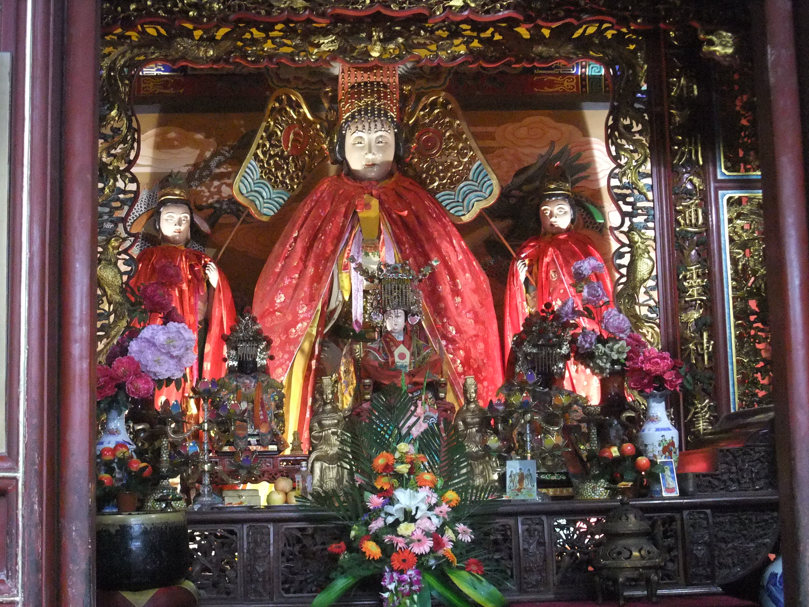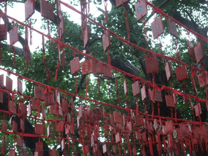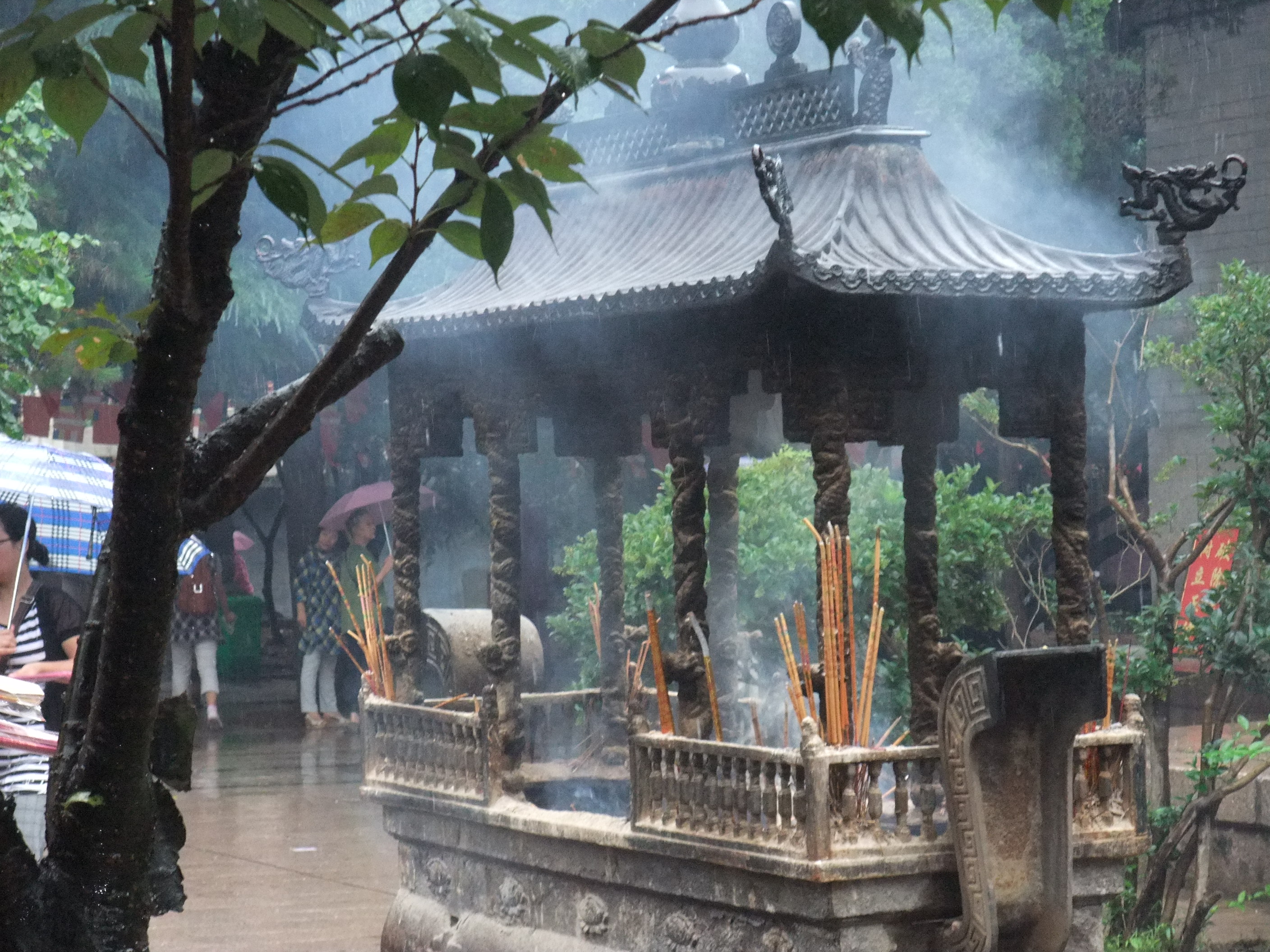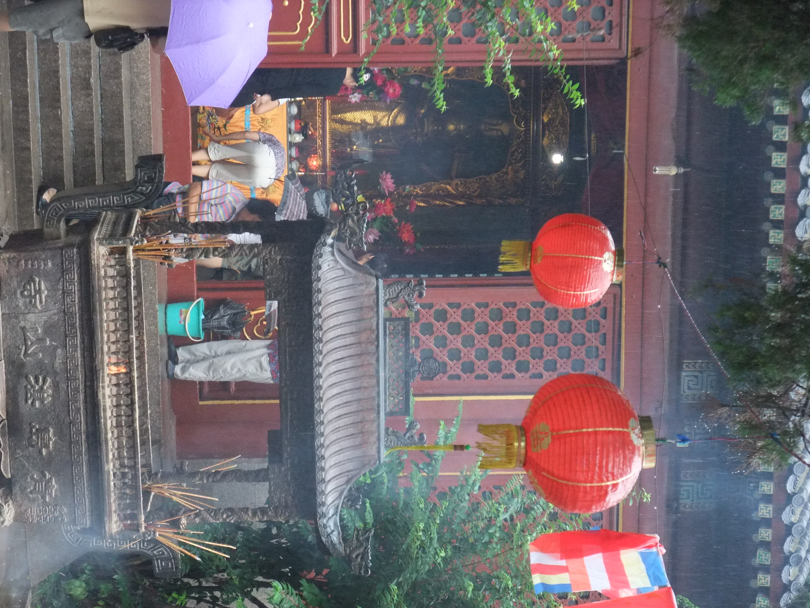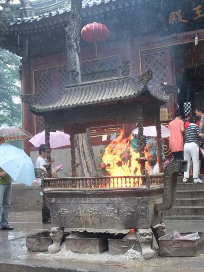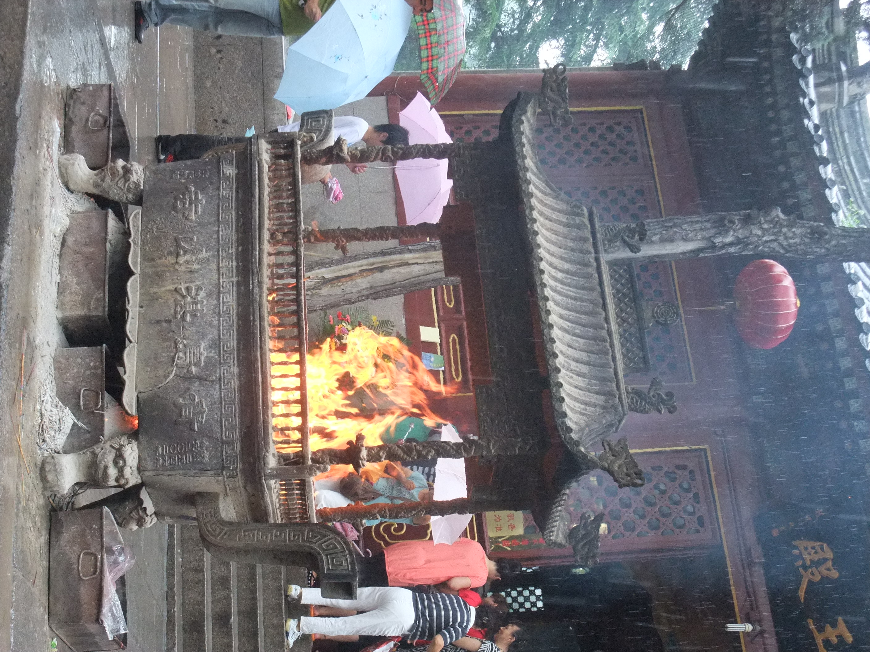 Even in the rain this place was really hopping. I don’t know if it was a special holiday, or if there are just so many people in this area that it’s bound to be packed even on a Wednesday morning. There was so much incense being lit and thrown in the pyres that the sticks were lighting, causing a flame and ash was pouring out the bottom.