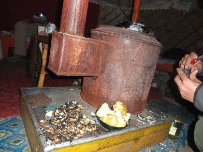 We had an interesting setup of trying to cook for ourselves on the ger stove. We used beer cans to roast potatoes in the fire, and used Danish cookie tins to boil yak meat, potatoes, carrots, onion, and beer on the top. For some reason the first night it took us six hours to cook. Inefficiency with the stove, copious amounts of Mongolian lager, and the three of us getting to know each other were to blame.