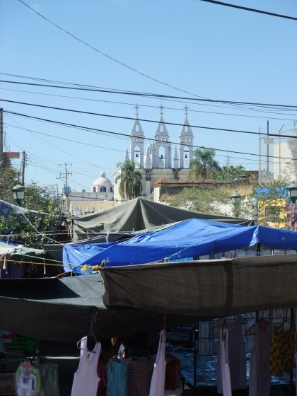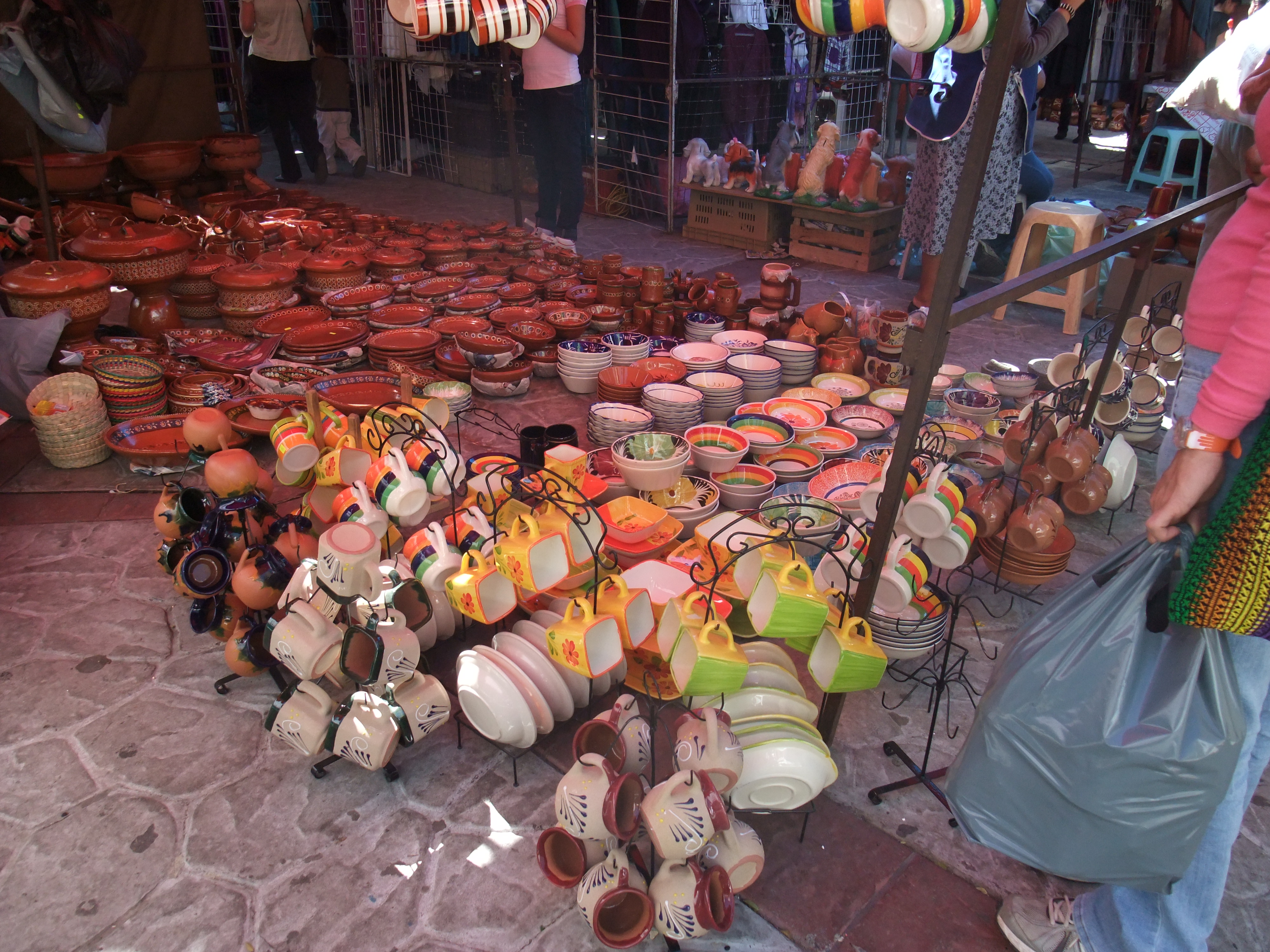 If Tlaquepaque is where tourists, Mexican and foreign alike, come to buy things, Tonala is where they are actually made. On Sunday the entire downtown of the city is a maze of covered stalls on every street packed in as close as possible with thousands of people pushing and shoving to get at the next best deal. The centro is turned into a sea of multi-colored ceramics, clothes with beautiful embroidery, shoes, hand-made beauty products, produce, and, of course, food. Or as the most racist of my three roommates claimed, “oh I don’t want to go, it’s probably all ghetto and stolen stuff anyway.” To quite the contrary, it is a gorgeous market in a rather beautiful plaza.