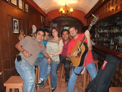 Saturday I went to the tostada stand where I get help with my homework. I ended up getting dragged, along with my guitar, to meet Pancho’s family. Pancho and his son, also Pancho, run the tostada stand where I first started playing music in town. He invites me to his sister’s house, and it turns out the cousin lived in California for ten years and speaks great English. He was my advisor for the night and kept an eye on things as people got out of hand and the tequila started to flow. We all headed down to the Parian to play some music and entertain folks, which as you can see, went very well. The bartender was extremely happy that this merry band of young men decided to stay for another round for the chance to sing along with the gringa.