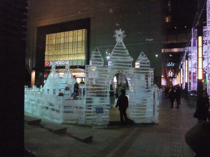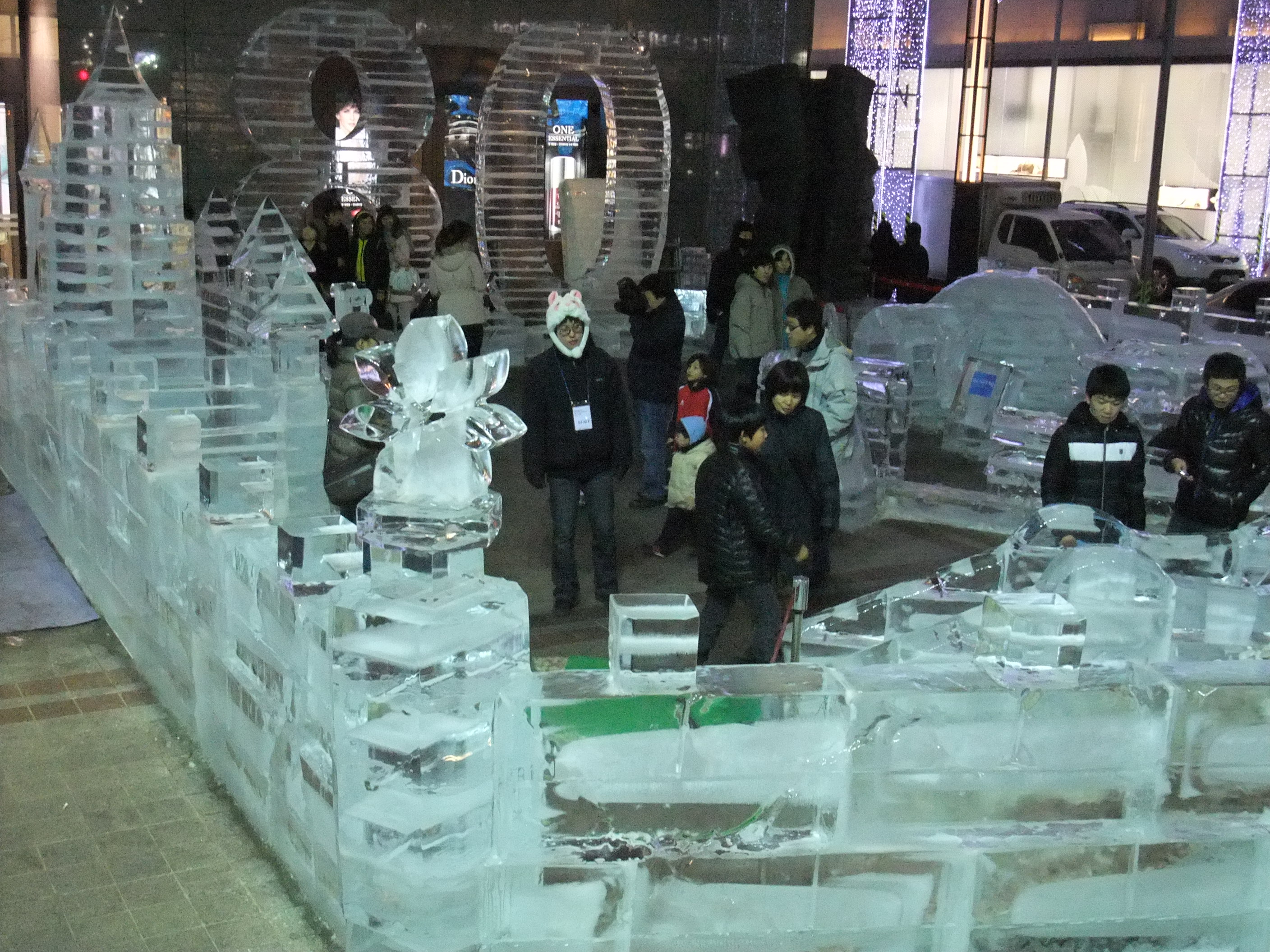 On my way back to Seoul I needed to find some food, which is not something I’m particularly good at. I decided to forgo the trusty foreign foods in Itaewon (even though I was craving empanadas), and went to Myeong-dong instead. I wasn’t very successful, but there is a nice ice sculpture outside of Shinsege. On a whim, I texted my one and only true Korean friend regarding a suggestion for where to eat. Joey, who gave himself his English name because he loves the show Friends, and his girlfriend picked me up and treated me for sushi at a new place they like. It was the perfect ending to a rambling day.